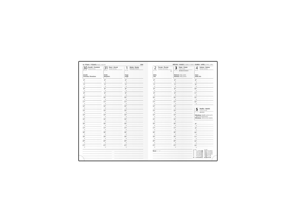 ýdenní záznamník, formát A5 143mm x 205mm, počet stran 128, vazba šitá V8, české a slovenské jmenné kalendárium, mezinárodní svátky, měsíční fáze, roční období, letní a zimní čas, čas východu a západu slunce, znamení zvěrokruhu, dny a měsíce ve 4 jazycích, osobní údaje, přehledný kalendář, měsíční plánování, roční plánovací kalendář, mezinárodní státní a církevní svátky, česká křestní jména, mezinárodní telefonní spojení, důležitá telefonní čísla, časová pásma, silniční vzdálenosti Evropa, místo na poznámky, předsádky: mapa České a Slovenské republiky.