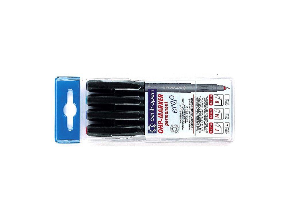 Speciální popisovač, určený pro psaní a kreslení na fólie pro zpětné projektory.Permanentní inkoust na lihové bázi, nesmývatelný vodou.Písmo lze odstranit lihem.Obsahuje barvy - červená, černá, modrá a zelená. Kód: 1056