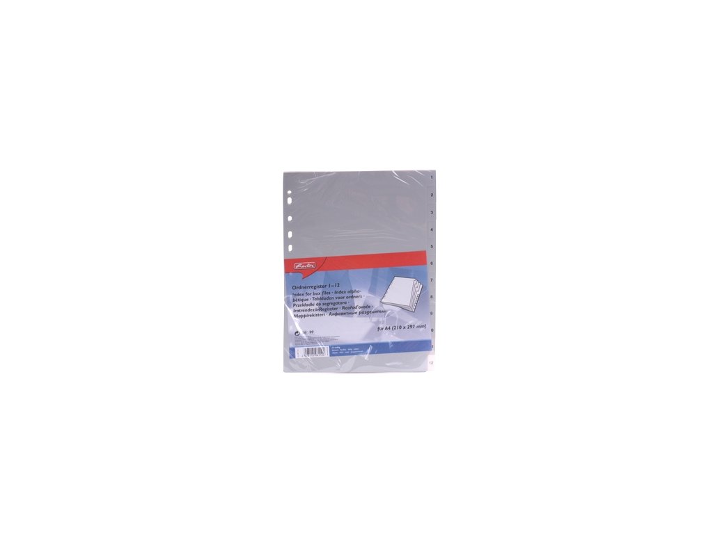 Rozřaďovač A4/12 dílů, euroděrování, plastový, 1 - 12, šedý. Kód: 2474
