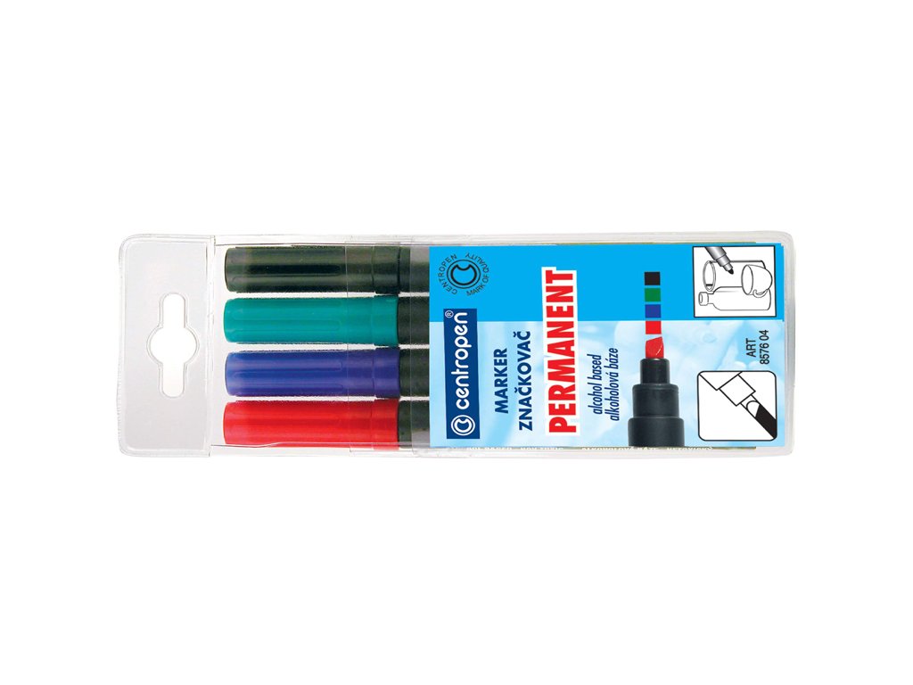 Permanentní značkovač.Píše na papír, kůži, plasty, kovy.Permanentní inkoust na alkoholové bázi.Obsahuje barvy - červená, černá, modrá a zelená. Kód: 2642